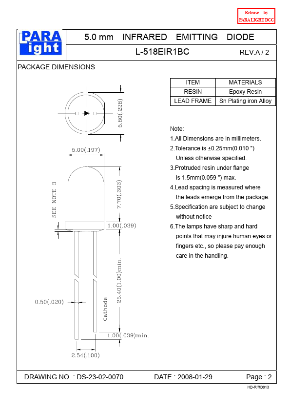 Release by PARA LIGHT DCC PARA LIGHT ELECTRONICS CO, LTD. 4F, No.1, Lane 93, Chien Yi Road, Chung Ho City, Taipei, Taiwan. para@para..tw http://.para..tw DATA SHEET PART NO.
