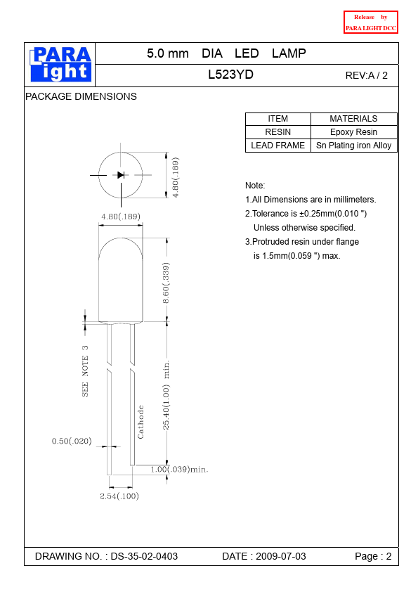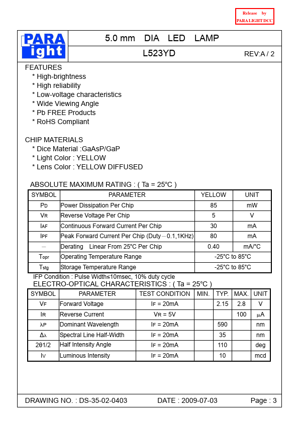 Release by PARA LIGHT DCC PARA LIGHT ELECTRONICS CO., LTD. 4F, No.1, Lane 93, Chien Yi Road, Chung Ho City, Taipei, Taiwan. para@para..tw http://.para..tw DATA SHEET PART NO.