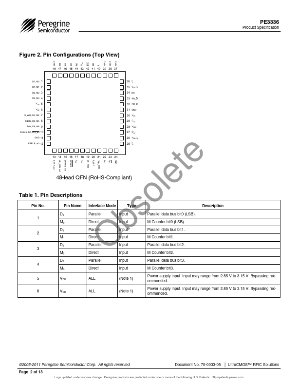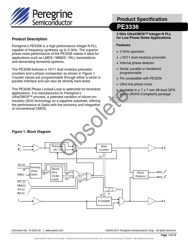 3 GHz UltraCMOS™ Integer-N PLL for Low Phase Noise Applications Peregrine’s PE3336 is a high performance integer-N PLL capable of frequency synthesis up to 3 GHz. The superior phase noise performance of the PE3336 makes it ideal for applications such as LMDS / MMDS / WLL basestations and demanding terrestrial systems.