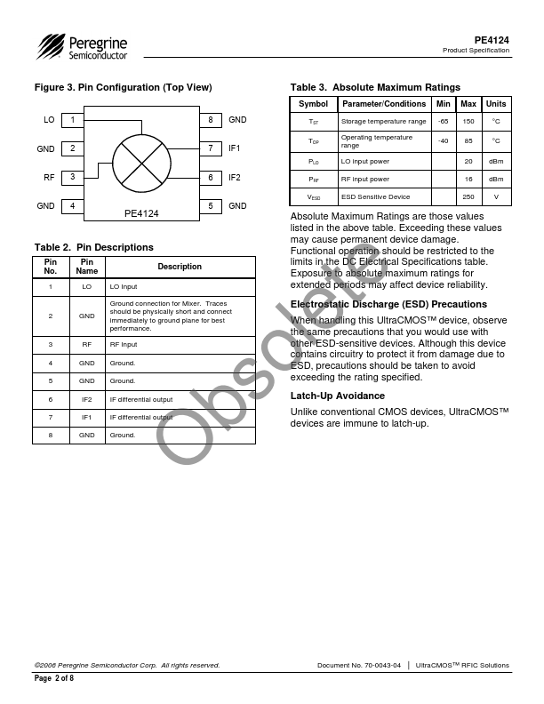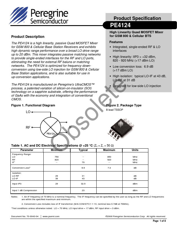 High Linearity Quad MOSFET Mixer for GSM 800 & Cellular BTS The PE4124 is a high linearity, passive Quad MOSFET Mixer.