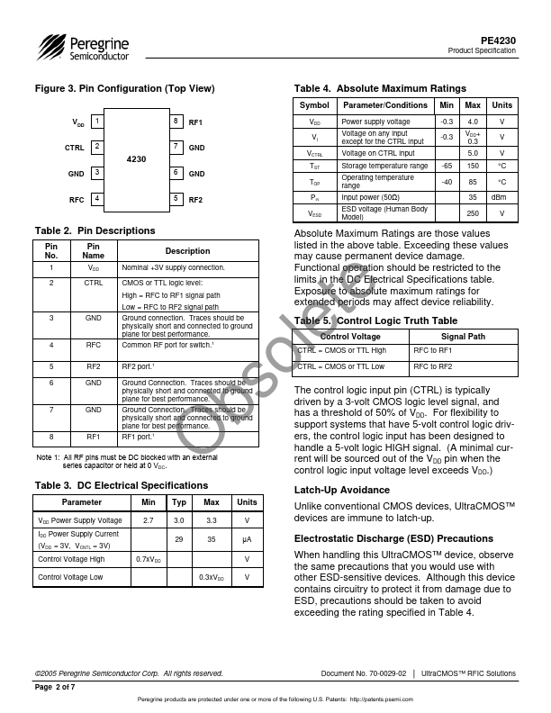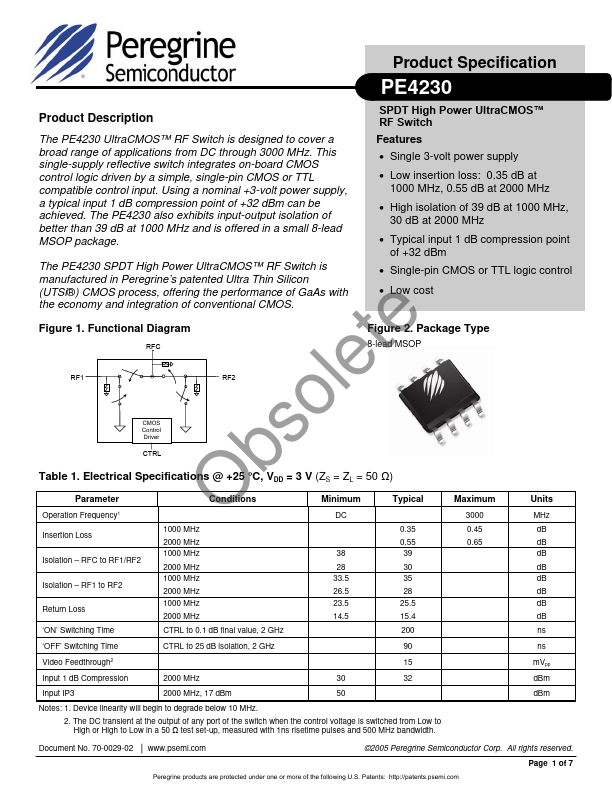 SPDT High Power UltraCMOS™ RF Switch The PE4230 UltraCMOS™ RF Switch is designed to cover.