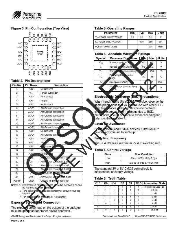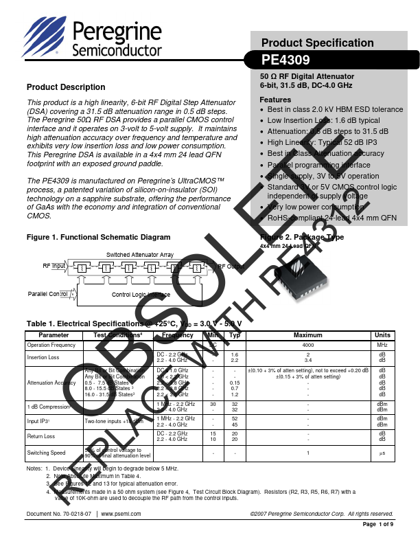 interface and it operates on 3-volt to 5-volt supply. It maintains high attenuation accuracy over frequency and temperature and exhibits very low insertion loss and low power consumption. This Peregrine DSA is available in a 4x4 mm 24 lead QFN footprint with an exposed ground paddle.