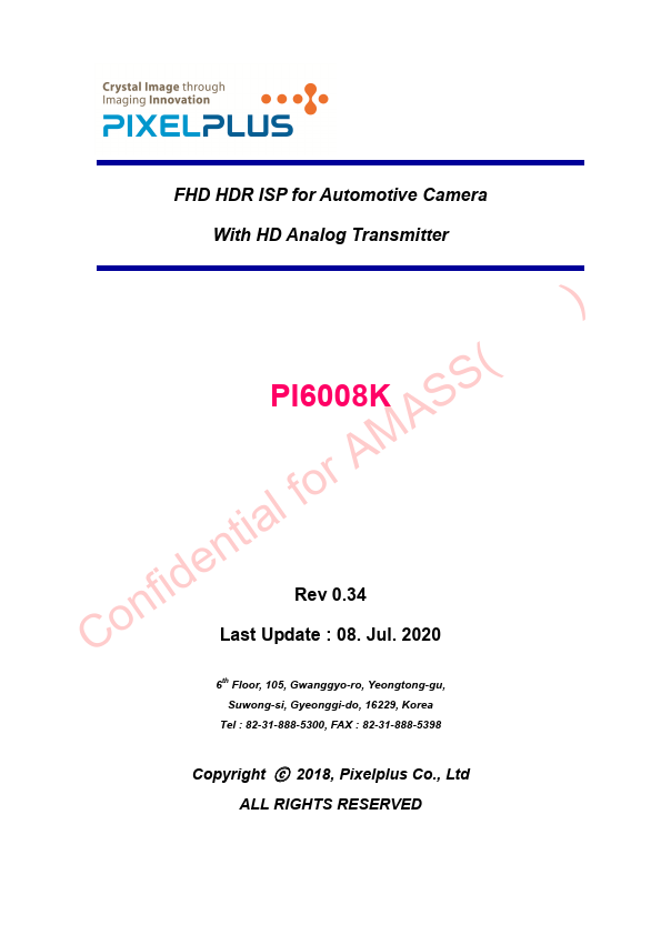 Product Overview The PI6008K is a high performance and low power HDR ISP for automotive application. It supports up to 2.0M SDR or HDR CMOS Image Sensor with parallel or MIPI interface.