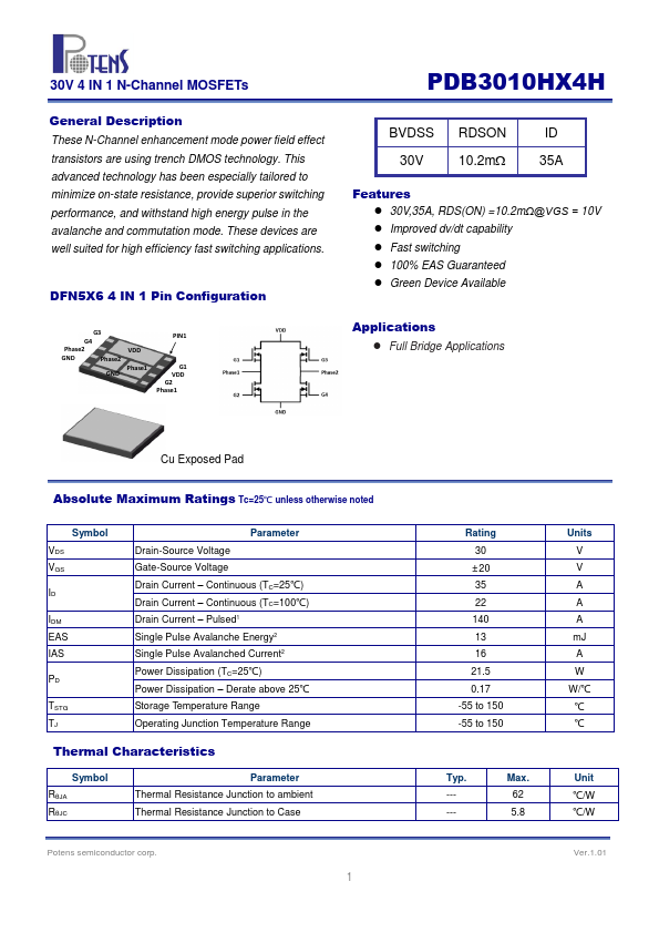 - 30V,35A, RDS(ON) =10.2mΩ@VGS = 10V