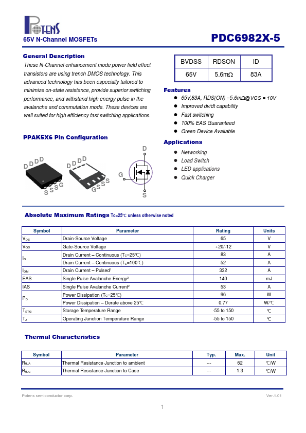 - 65V,83A, RDS(ON) =5.6mΩ@VGS = 10V