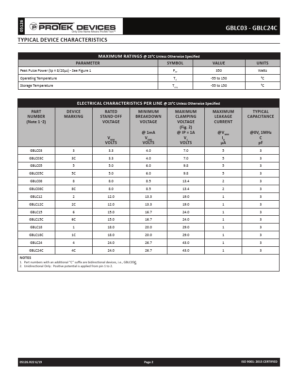 The GBLCxx and GBLCxxC Series are ultra low capacitance transient voltage suppressor arrays, designed to protect applications such as portable electronics and SMART phones. This series is available in both unidirectional and bidirectional configurations and is rated at 350 Watts for an 8/20µs waveshape. The GBLCxx and GBLCxxC Series meets IEC 61000-4-2 (ESD) and IEC 61000-4-4 (EFT) requirements.