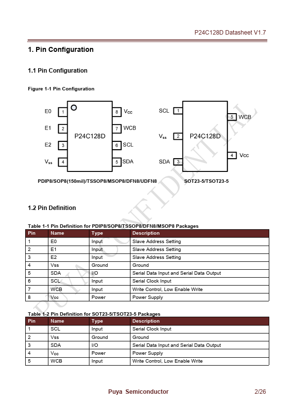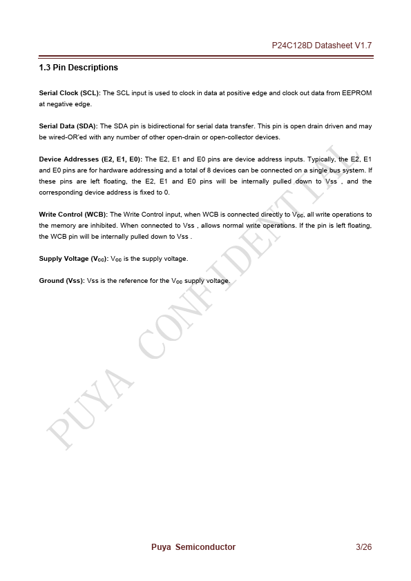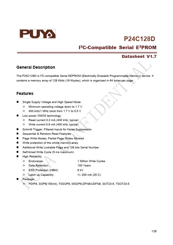 The P24C128D is I2C-patible Serial EEPROM (Electrically Erasable Programmable Memory) device. It contains a memory array of 128 Kbits (16 Kbytes), which is organized in 64 bytes per page.