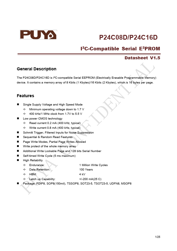 The P24C08D/P24C16D is I2C-patible Serial EEPROM (Electrically Erasable Programmable Memory) device. It contains a memory array of 8 Kbits (1 Kbytes)/16 Kbits (2 Kbytes), which is 16 bytes per page.