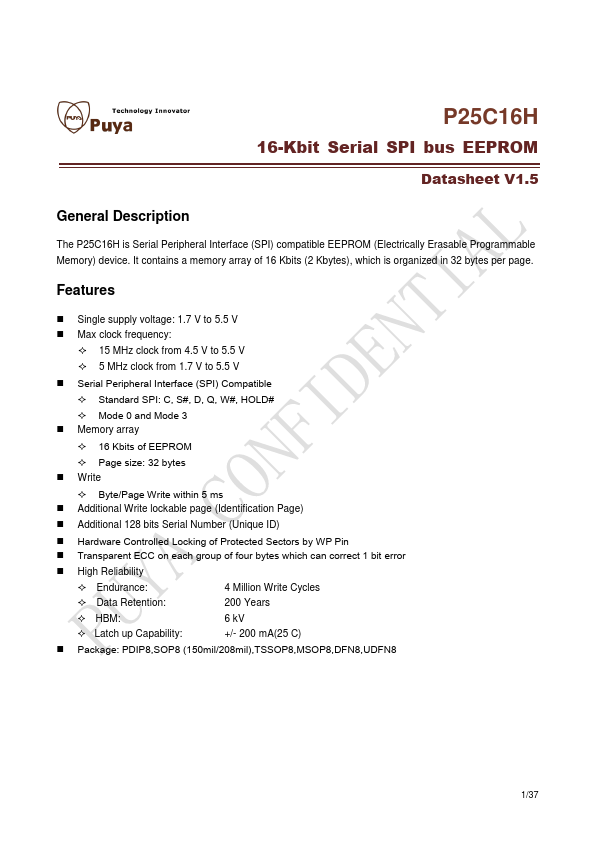 The P25C16H is Serial Peripheral Interface (SPI) patible EEPROM (Electrically Erasable Programmable Memory) device. It contains a memory array of 16 Kbits (2 Kbytes), which is organized in 32 bytes per page.