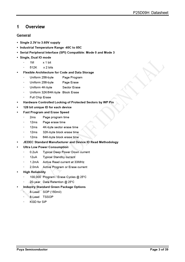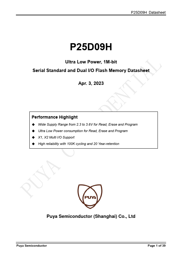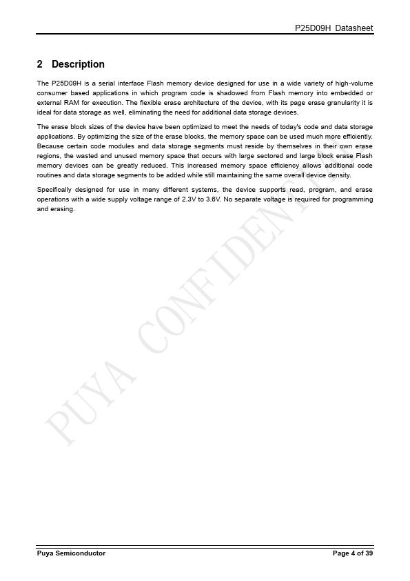The P25D09H is a serial interface Flash memory device designed for use in a wide variety of high-volume consumer based applications in which program code is shadowed from Flash memory into embedded or external RAM for execution. The flexible erase architecture of the device, with its page erase granularity it is ideal for data storage as well, eliminating the need for additional data storage devices. The erase block...