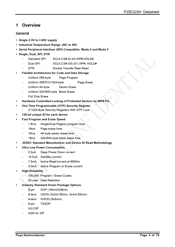 The P25D32SH is a serial interface Flash memory device designed for use in a wide variety of high-volume consumer based applications in which program code is shadowed from Flash memory into embedded or external RAM for execution. The flexible erase architecture of the device, with its page erase granularity it is ideal for data storage as well, eliminating the need for additional data storage devices. The erase...