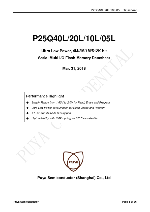 The P25Q40L/20L/10L/05L is a serial interface Flash memory device designed for use in a wide variety of high-volume consumer based applications in which program code is shadowed from Flash memory into embedded or external RAM for execution. The flexible erase architecture of the device, with its page erase granularity it is ideal for data storage as well, eliminating the need for additional data storage devices. The...