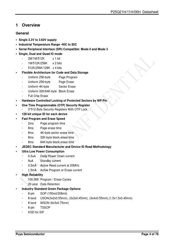 The P25Q21H/11H/06H is a serial interface Flash memory device designed for use in a wide variety of high-volume consumer based applications in which program code is shadowed from Flash memory into embedded or external RAM for execution. The flexible erase architecture of the device, with its page erase granularity it is ideal for data storage as well, eliminating the need for additional data storage devices. The...