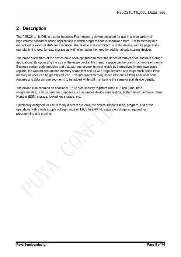The P25Q21L/11L/06L is a serial interface Flash memory device designed for use in a wide variety of high-volume consumer based applications in which program code is shadowed from Flash memory into embedded or external RAM for execution. The flexible erase architecture of the device, with its page erase granularity it is ideal for data storage as well, eliminating the need for additional data storage devices. The...
