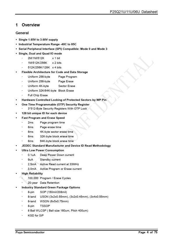 The P25Q21U/11U/06U is a serial interface Flash memory device designed for use in a wide variety of highvolume consumer based applications in which program code is shadowed from Flash memory into embedded or external RAM for execution. The flexible erase architecture of the device, with its page erase granularity it is ideal for data storage as well, eliminating the need for additional data storage devices. The...
