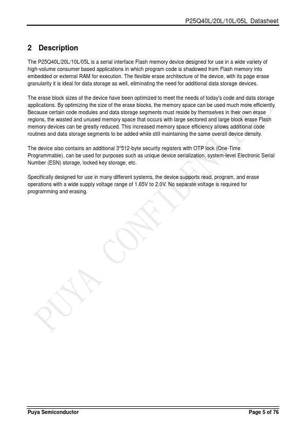 The P25Q40L/20L/10L/05L is a serial interface Flash memory device designed for use in a wide variety of high-volume consumer based applications in which program code is shadowed from Flash memory into embedded or external RAM for execution. The flexible erase architecture of the device, with its page erase granularity it is ideal for data storage as well, eliminating the need for additional data storage devices. The...