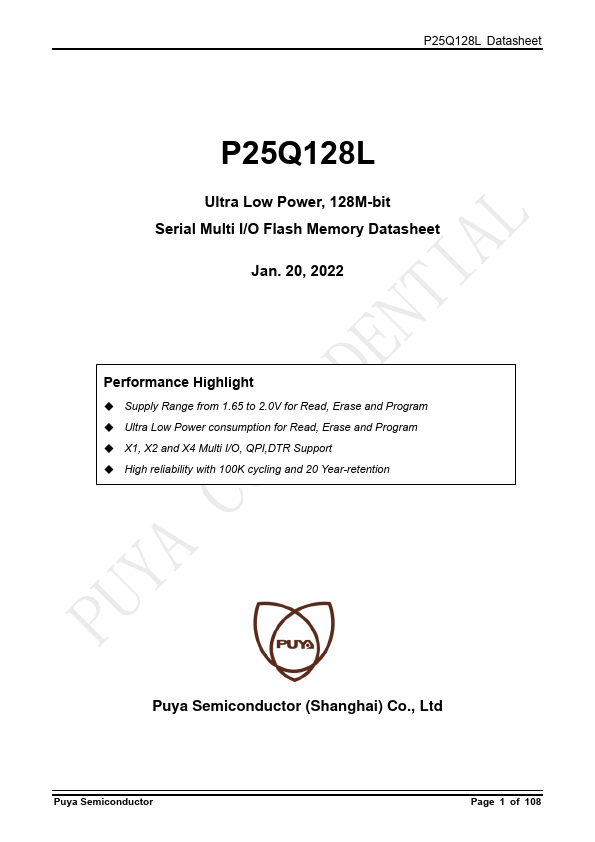P25Q128L is 128M-bit Serial Multi I/O Flash Memory manufactured by Puya Semiconductor.