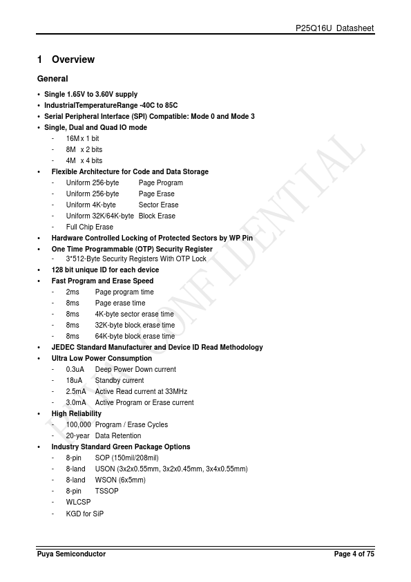 The P25Q16U is a serial interface Flash memory device designed for use in a wide variety of high-volume consumer based applications in which program code is shadowed from Flash memory into embedded or external RAM for execution. The flexible erase architecture of the device, with its page erase granularity it is ideal for data storage as well, eliminating the need for additional data storage devices. The erase block...