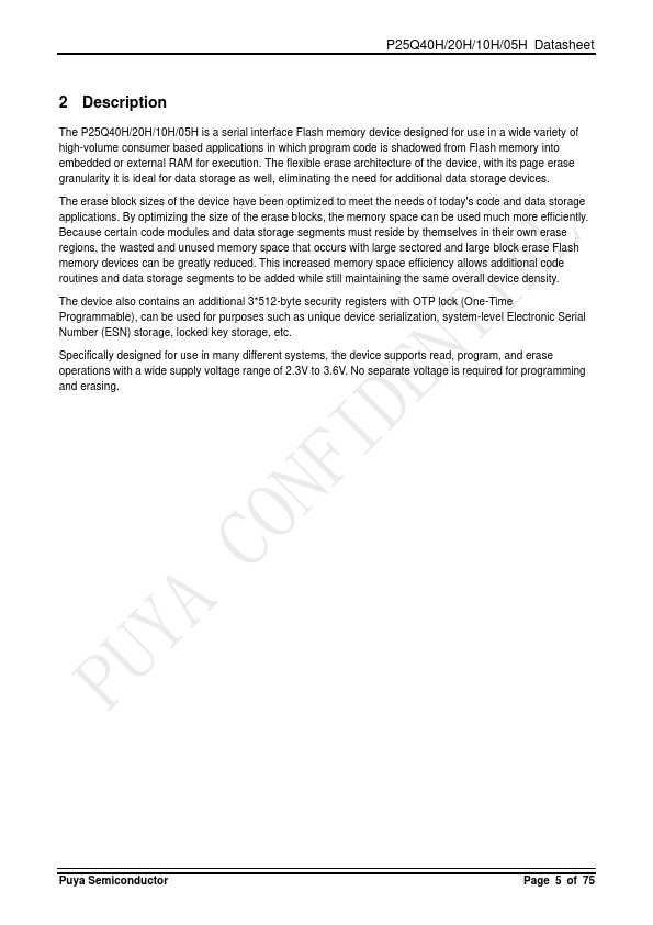 The P25Q40H/20H/10H/05H is a serial interface Flash memory device designed for use in a wide variety of high-volume consumer based applications in which program code is shadowed from Flash memory into embedded or external RAM for execution. The flexible erase architecture of the device, with its page erase granularity it is ideal for data storage as well, eliminating the need for additional data storage devices. The...