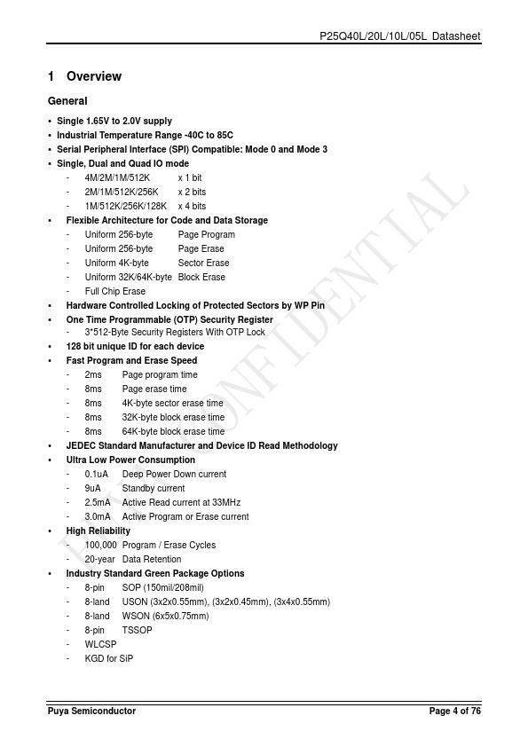 The P25Q40L/20L/10L/05L is a serial interface Flash memory device designed for use in a wide variety of high-volume consumer based applications in which program code is shadowed from Flash memory into embedded or external RAM for execution. The flexible erase architecture of the device, with its page erase granularity it is ideal for data storage as well, eliminating the need for additional data storage devices. The...