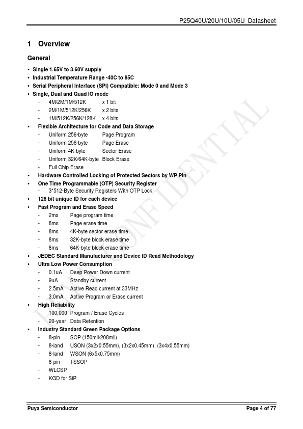 The P25Q40U/20U/10U/05U is a serial interface Flash memory device designed for use in a wide variety of high-volume consumer based applications in which program code is shadowed from Flash memory into embedded or external RAM for execution. The flexible erase architecture of the device, with its page erase granularity it is ideal for data storage as well, eliminating the need for additional data storage devices. The...
