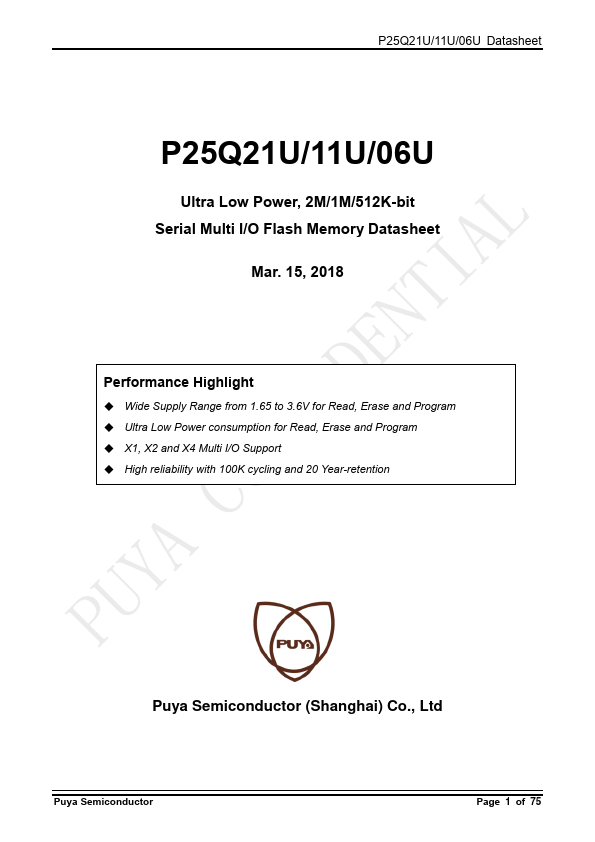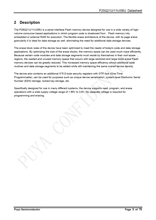 The P25Q21U/11U/06U is a serial interface Flash memory device designed for use in a wide variety of highvolume consumer based applications in which program code is shadowed from Flash memory into embedded or external RAM for execution. The flexible erase architecture of the device, with its page erase granularity it is ideal for data storage as well, eliminating the need for additional data storage devices. The...