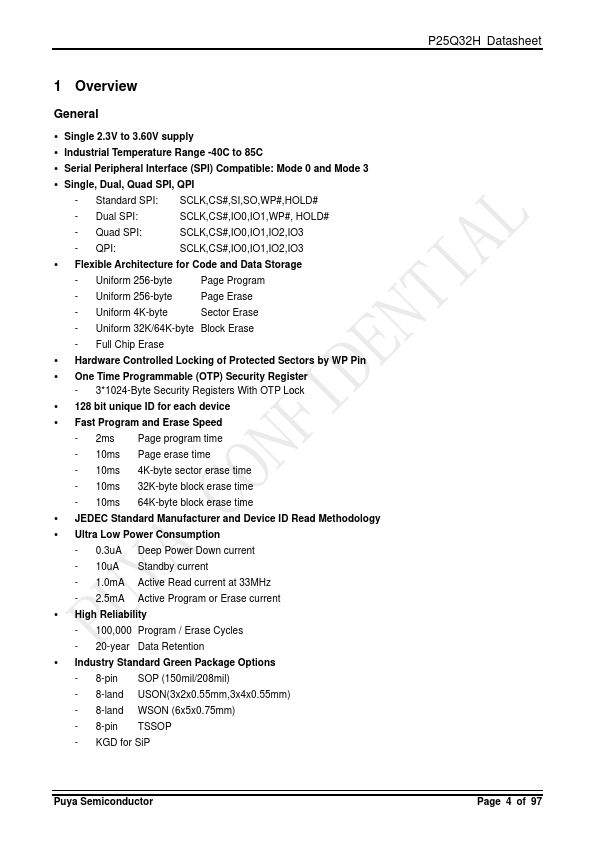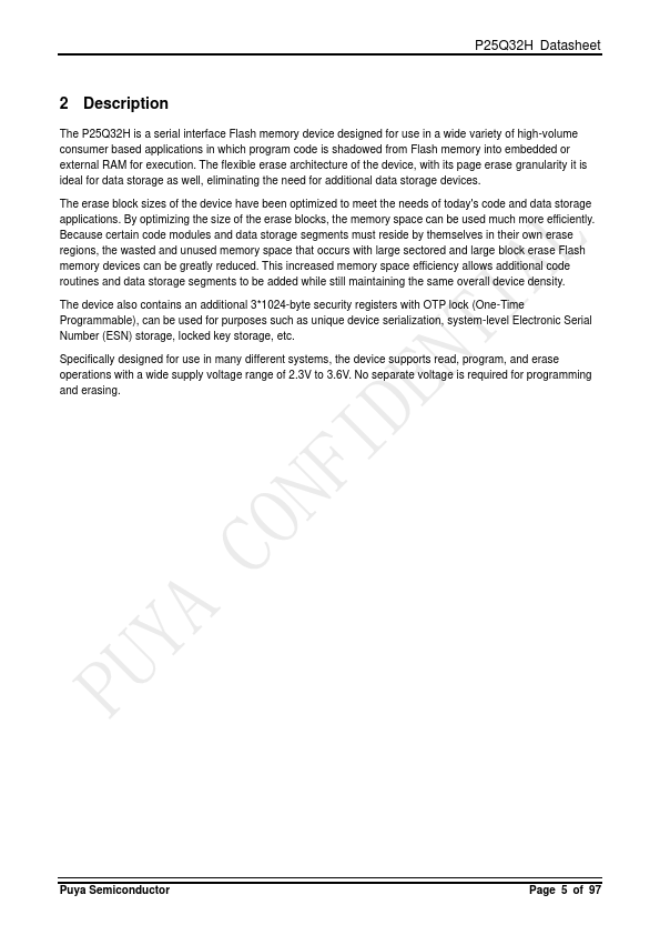 The P25Q32H is a serial interface Flash memory device designed for use in a wide variety of high-volume consumer based applications in which program code is shadowed from Flash memory into embedded or external RAM for execution. The flexible erase architecture of the device, with its page erase granularity it is ideal for data storage as well, eliminating the need for additional data storage devices. The erase block...