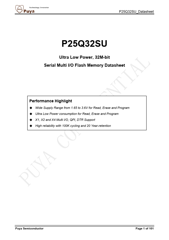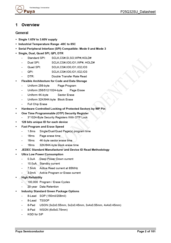 The P25Q32SU is a serial interface Flash memory device designed for use in a wide variety of high-volume consumer based applications in which program code is shadowed from Flash memory into embedded or external RAM for execution. The flexible erase architecture of the device, with its page erase granularity it is ideal for data storage as well, eliminating the need for additional data storage devices. The erase...