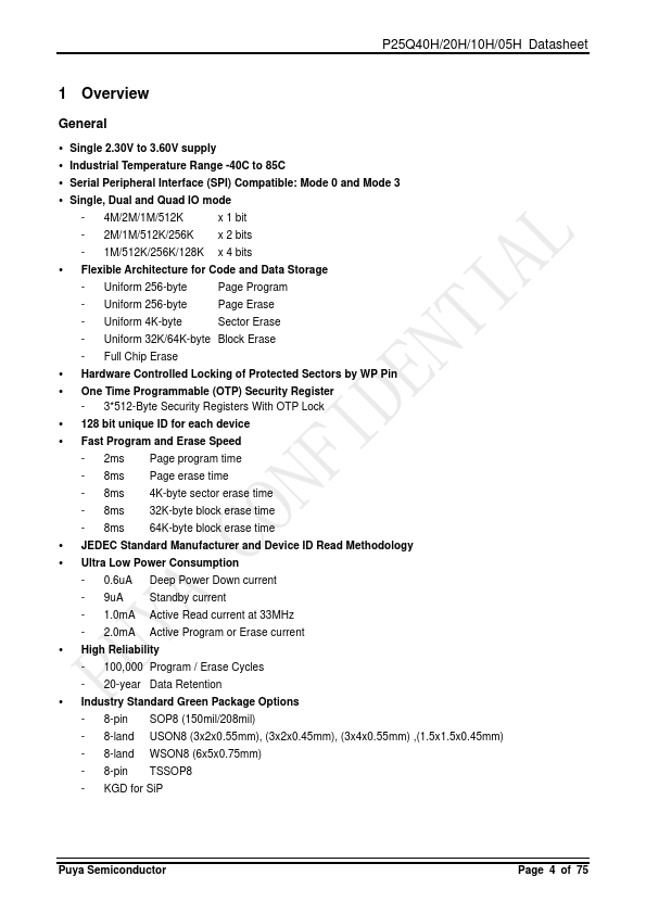 The P25Q40H/20H/10H/05H is a serial interface Flash memory device designed for use in a wide variety of high-volume consumer based applications in which program code is shadowed from Flash memory into embedded or external RAM for execution. The flexible erase architecture of the device, with its page erase granularity it is ideal for data storage as well, eliminating the need for additional data storage devices. The...