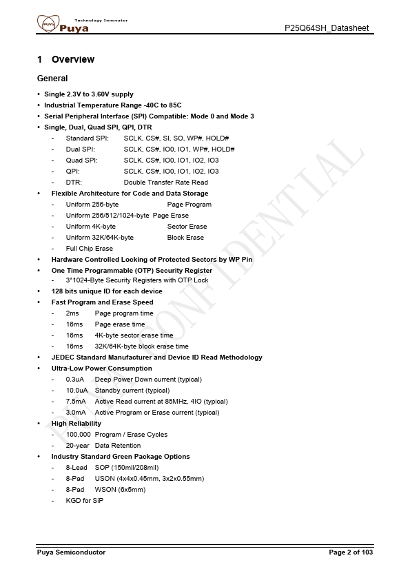 The P25Q64SH is a serial interface Flash memory device designed for use in a wide variety of high-volume consumer-based applications in which program code is shadowed from Flash memory into embedded or external RAM for execution. The flexible erase architecture of the device, with its page erase granularity it is ideal for data storage as well, eliminating the need for additional data storage devices. The erase...