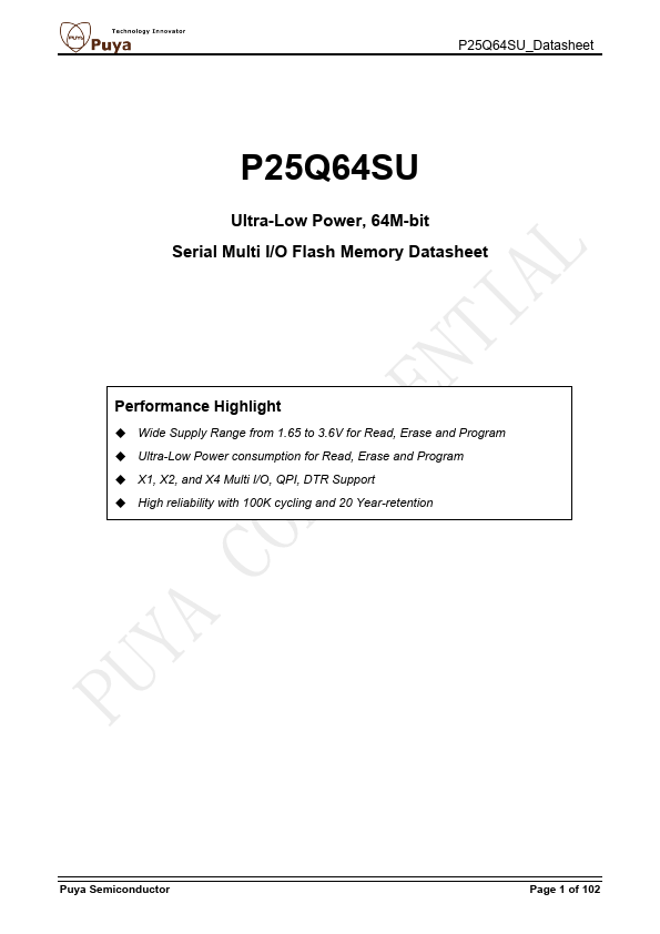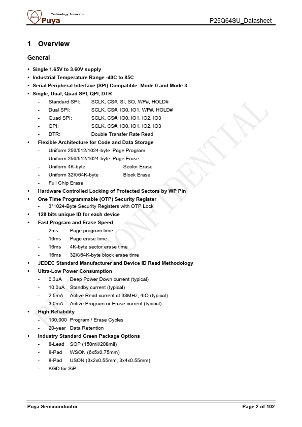 The P25Q64SU is a serial interface Flash memory device designed for use in a wide variety of high-volume consumer-based applications in which program code is shadowed from Flash memory into embedded or external RAM for execution. The flexible erase architecture of the device, with its page erase granularity it is ideal for data storage as well, eliminating the need for additional data storage devices. The erase...