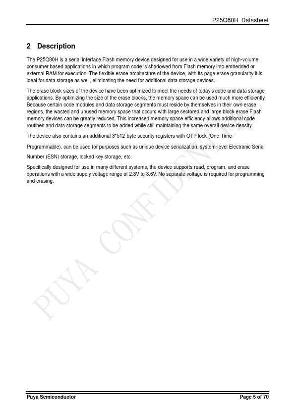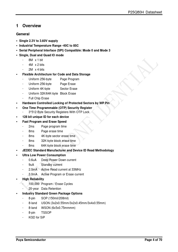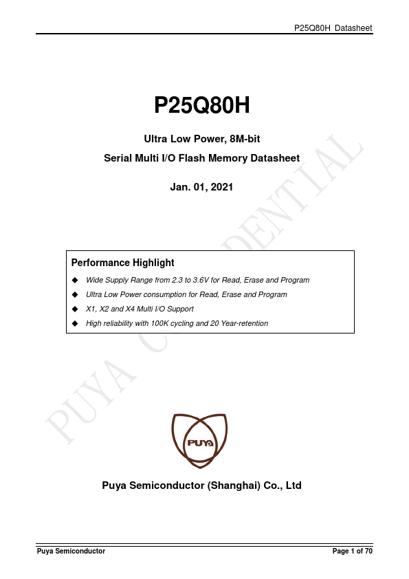 The P25Q80H is a serial interface Flash memory device designed for use in a wide variety of high-volume consumer based applications in which program code is shadowed from Flash memory into embedded or external RAM for execution. The flexible erase architecture of the device, with its page erase granularity it is ideal for data storage as well, eliminating the need for additional data storage devices. The erase block...