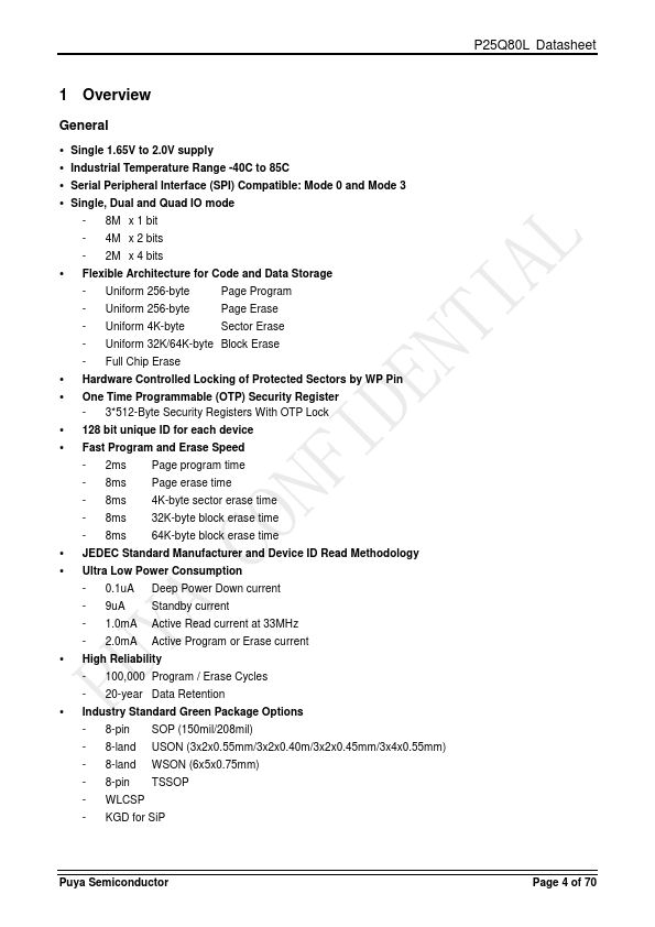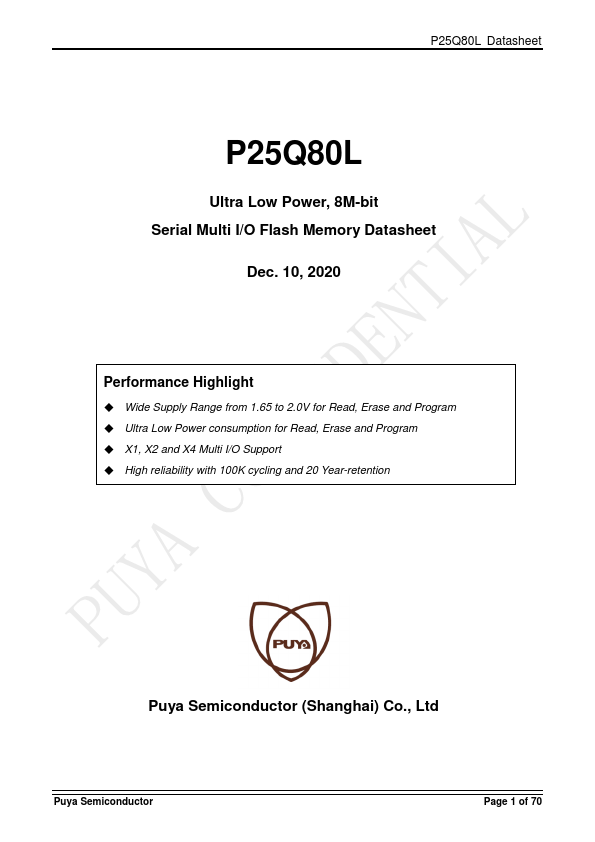 The P25Q80L is a serial interface Flash memory device designed for use in a wide variety of high-volume consumer based applications in which program code is shadowed from Flash memory into embedded or external RAM for execution. The flexible erase architecture of the device, with its page erase granularity it is ideal for data storage as well, eliminating the need for additional data storage devices. The erase block...