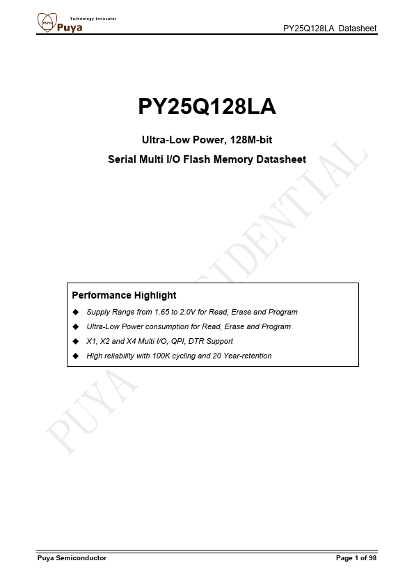 The PY25Q128LA is a serial interface Flash memory device designed for use in a wide variety of high-volume consumer-based applications in which program code is shadowed from Flash memory into embedded or external RAM for execution. The flexible erase architecture of the device, with its page erase granularity it is ideal for data storage as well, eliminating the need for additional data storage devices. The erase...