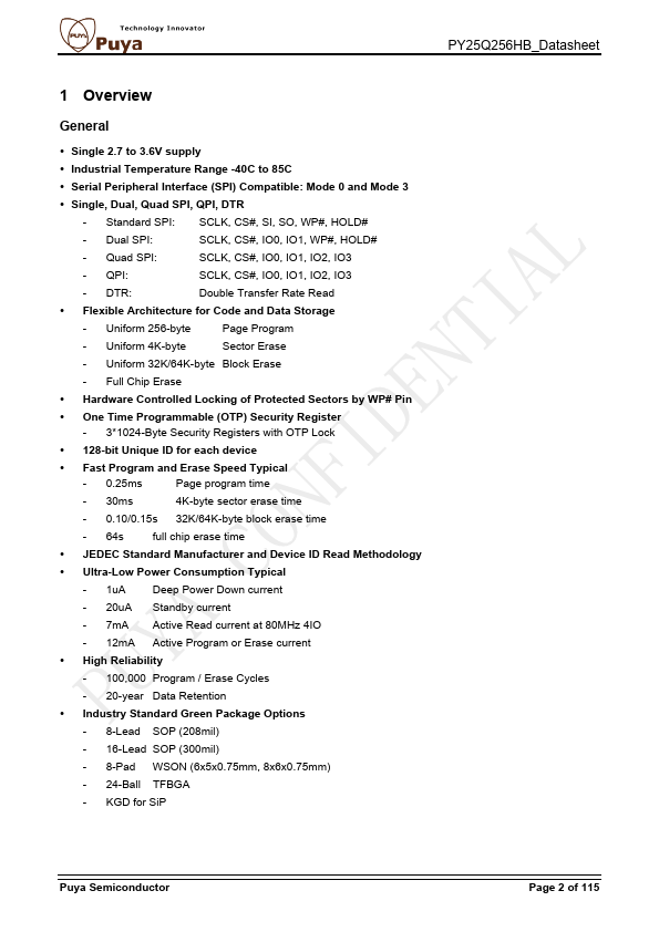 The PY25Q256HB is a serial interface Flash memory device designed for use in a wide variety of high-volume consumer-based applications in which program code is shadowed from Flash memory into embedded or external RAM for execution. The flexible erase architecture of the device, with its page erase granularity it is ideal for data storage as well, eliminating the need for additional data storage devices. The erase...
