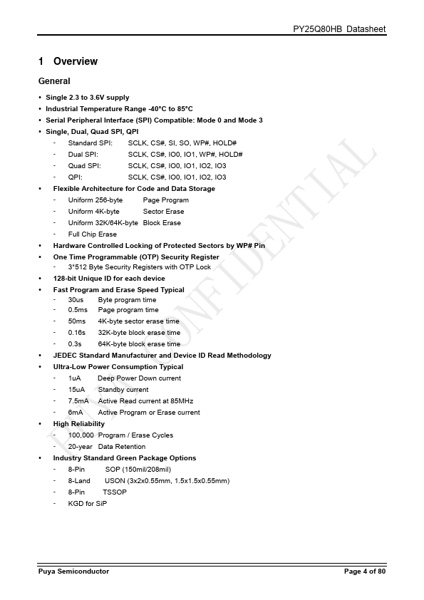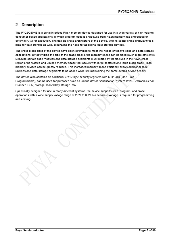 The PY25Q80HB is a serial interface Flash memory device designed for use in a wide variety of high-volume consumer-based applications in which program code is shadowed from Flash memory into embedded or external RAM for execution. The flexible erase architecture of the device, with its sector erase granularity it is ideal for data storage as well, eliminating the need for additional data storage devices. The erase...