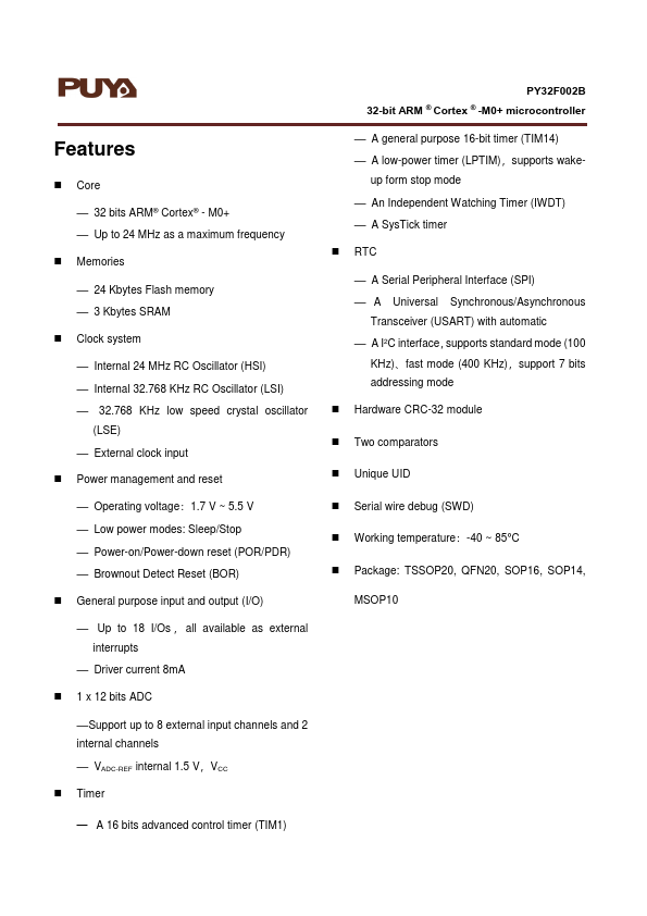 PY32F002B datasheet 32 bits ARM® Cortex® - M0+ Puya Semiconductor (Shanghai) Co., Ltd.