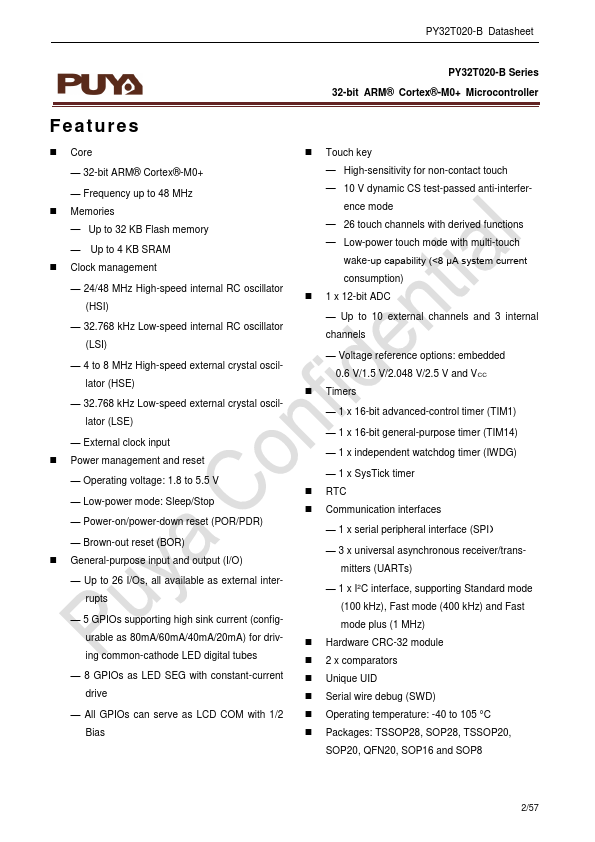 PY32T020-B Datasheet 32-bit ARM® Cortex®-M0+ Microcontroller Puya Semiconductor (Shanghai) Co., Ltd. PY32T020-B Datasheet PY32T020-B Series 32-bit ARM® Cortex®-M0+ Microcontroller.