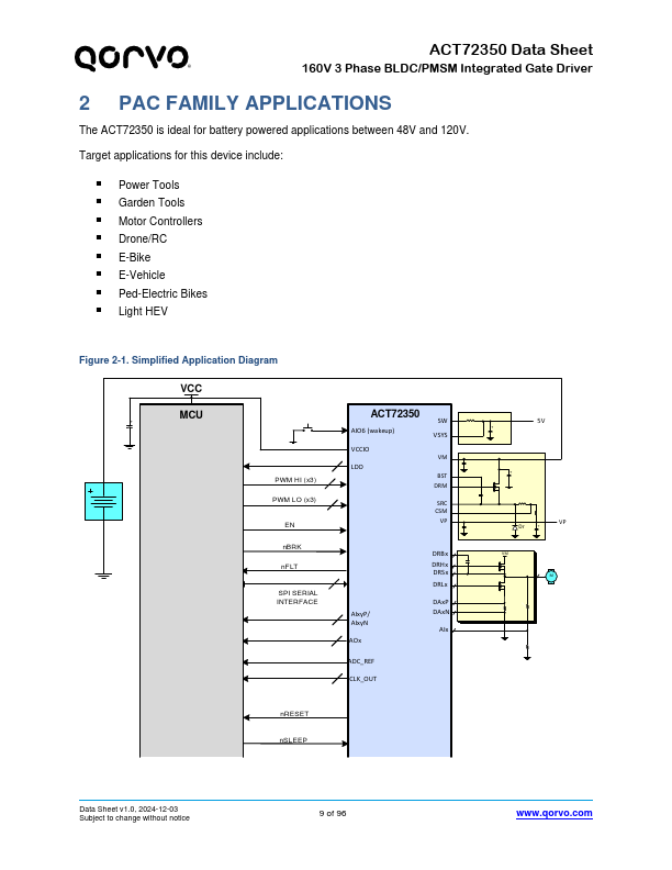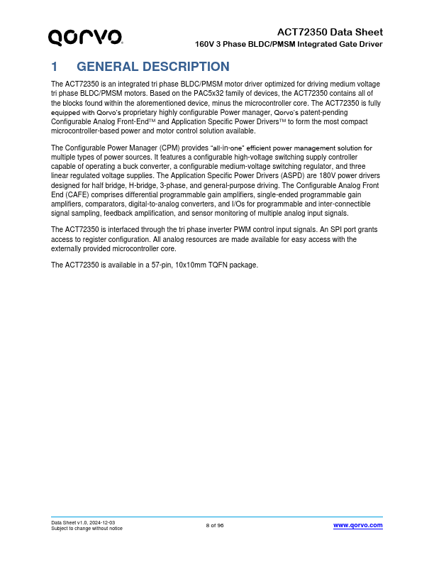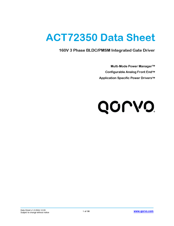 The ACT72350 is an integrated tri phase BLDC/PMSM motor driver optimized for driving medium voltage tri phase BLDC/PMSM motors. Based on the PAC5x32 family of devices, the ACT72350 contains all of the blocks found within the aforementioned device, minus the microcontroller core. The ACT72350 is fully equipped with Qorvo’s proprietary highly configurable Power manager, Qorvo’s patent-pending Configurable Analog...