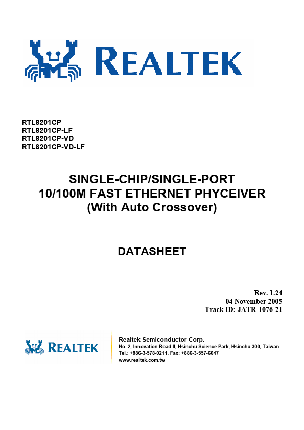 The RTL8201CP is a single-chip/single-port PHYceiver with an MII (Media Independent Interface)/SNI (Serial Network Interface). It implements all 10/100M Ethernet Physical-layer functions including the Physical Coding Sublayer (PCS), Physical Medium Attachment (PMA), Twisted Pair Physical Medium...