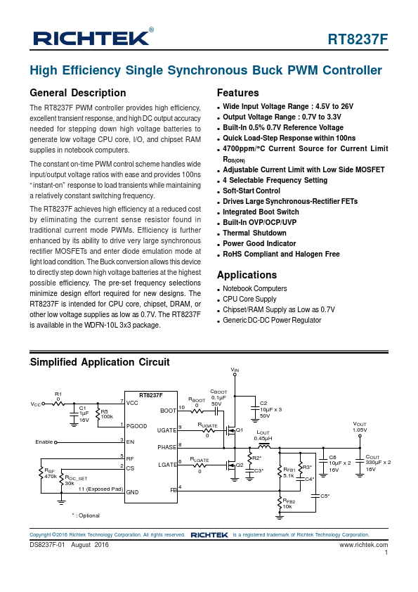 The RT8237F PWM controller provides high efficiency, excellent transient response, and high DC output accuracy needed for stepping down high voltage batteries to generate low voltage CPU core, I/O, and chipset RAM supplies in notebook puters.