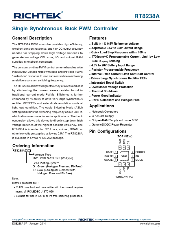 The RT8238A PWM controller provides high efficiency, excellent transient response, and high DC output accuracy needed for stepping down high voltage batteries to generate low voltage CPU core, I/O, and chipset RAM supplies in notebook puters.