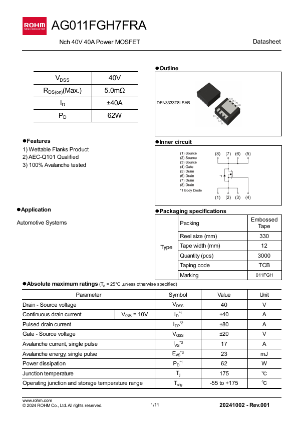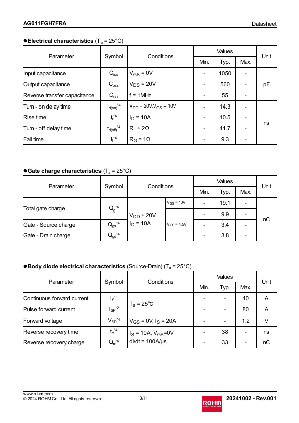 1/11 20241002 - Rev.001 AG011FGH7FRA lThermal resistance Parameter , junction - case Datasheet Symbol RthJC 1 Values Unit Min. - 1050 - - 560 - pF - 55 - - 14.3 - - 10.5 ns - 41.7 - - 9.3 - lGate charge characteristics (Ta = 25°C) Parameter.