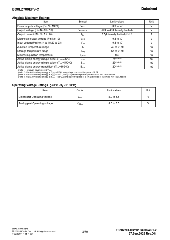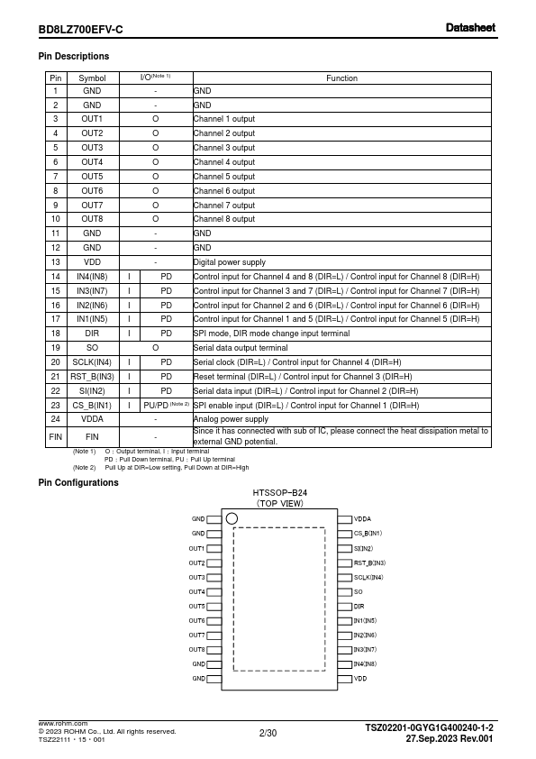 Features ■ Monolithic power IC that has a built-in control part (CMOS) and a power MOS FET on 1chip ■ 8ch Low-side switch for driving resistive, inductive load ■ 16bit Serial peripheral interface(SPI) for diagnostics and control ■ Built-in Open Load Detection circuit in output-off state ■ Built-in Over Current Protection circuit (OCP) ■ Built-in Active Clamp circuit ■ Built-in Thermal shutdown circuit (TSD) ■ Low On resistance of RON=700mΩ(VIN=5V, Tj=25°C, Io=0.2A, Typ) ■ Surface mount HTSSOP-B24 Package ■ AEC-Q100 Qualified (Note 1)
