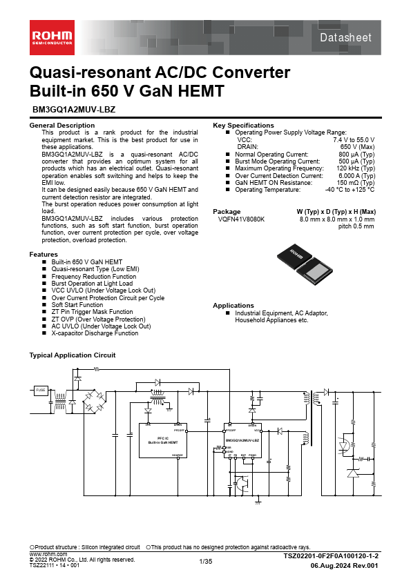 This product is a rank product for the industrial equipment market. This is the best product for use in these applications. BM3GQ1A2MUV-LBZ is a quasi-resonant AC/DC converter that provides an optimum system for all products which has an electrical outlet.