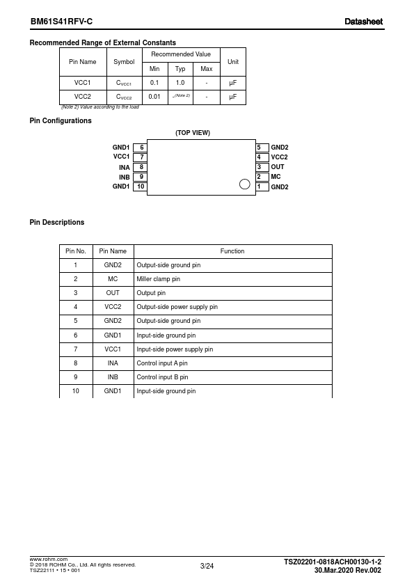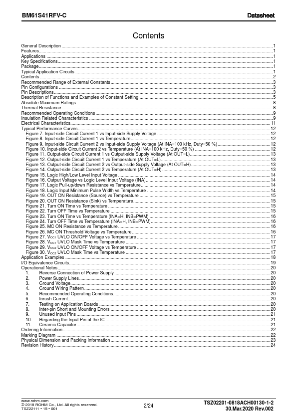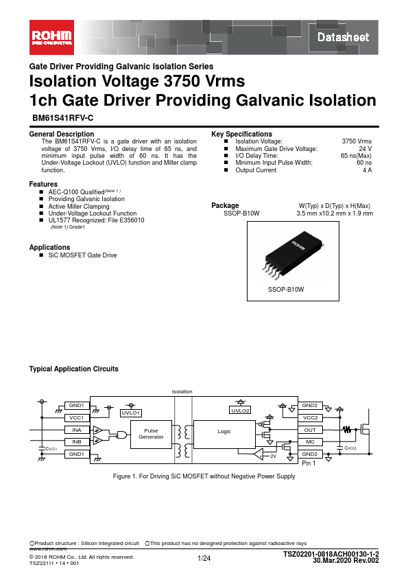 General Description The BM61S41RFV-C is a gate driver with an isolation voltage of 3750 Vrms, I/O delay time of 65 ns, and minimum input pulse width of 60 ns. It has the Under-Voltage Lockout (UVLO) function and Miller clamp function.
