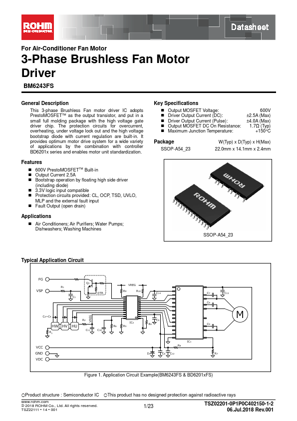 This 3-phase Brushless Fan motor driver IC adopts PrestoMOSFETTM as the output transistor, and put in a small full molding package with the high voltage gate driver chip. The protection circuits for overcurrent, overheating, under voltage lock out and the high voltage bootstrap diode with current regulation are built-in. It provides optimum motor drive system for a wide variety of applications by the bination with...