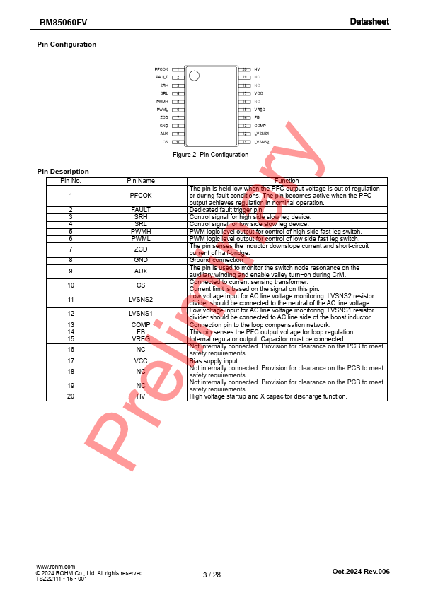 The BM85060FV is a critical conduction mode (CrM) power factor correction (PFC) controller IC designed to drive a bridgeless totem pole PFC topology. Bridgeless totem pole PFC consists of two totem pole legs: a fast-switching leg driven at high switching frequencies and a second leg operating at AC line frequency. This topology eliminates the need for a diode bridge, which is essential in conventional PFC circuits, and significantly improves efficiency and power density.