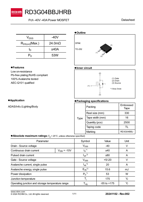 1/11 20241102 - Rev.002 RD3G04BBJHRB lThermal resistance Parameter , junction - case Datasheet Symbol RthJC 1 Values Unit Min. - 1380 - - 170 - pF - 135 - - 7 - - 8 - ns - 63 - - 13 - lGate charge characteristics (Ta = 25°C) Parameter Symbol Conditions Values Unit Min. Total gate charge Gate - Source charge Gate - Drain charge VGS = -10V - 27.6 - Qg VDD ⋍ -20V - 13.0 nC Qgs ID = -10A VGS = -4.5V - 4.8 - Qgd - 5.8 -...