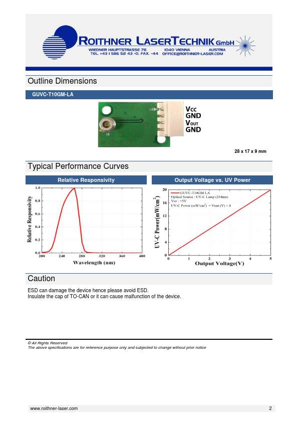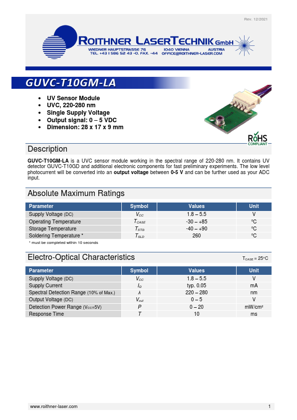 GUVC-T10GM-LA is a UVC sensor module working in the spectral range of 220-280 nm. It contains UV detector GUVC-T10GD and additional electronic ponents for fast preliminary experiments. The low level photocurrent will be converted into an output voltage between 0-5 V and can be further used as your ADC input.